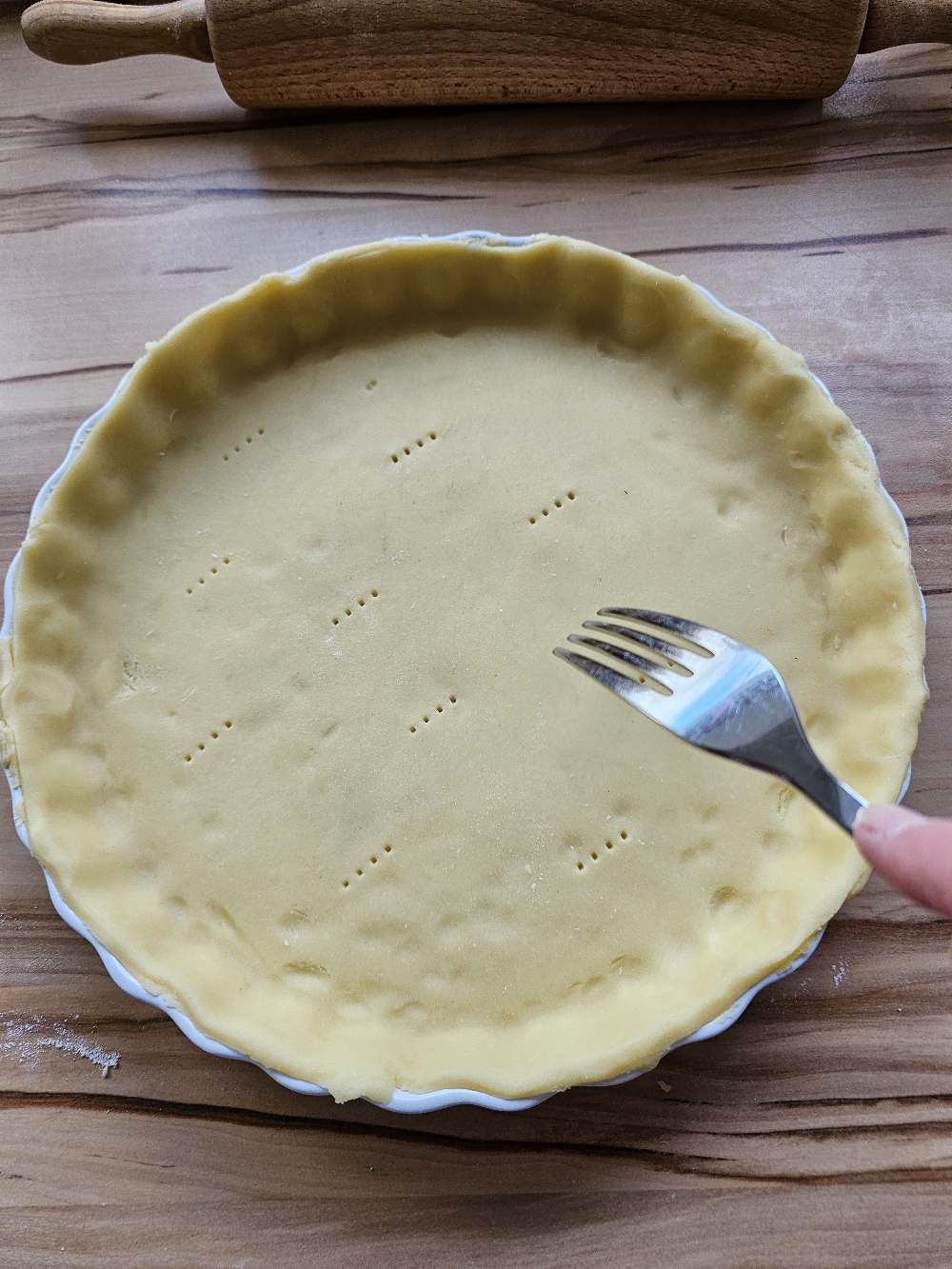 Den ausgerollten Teig legt ihr dann auf die gefettete Quicheform. Den überstehenden Teig schneidet ihr mit einem Messer ab. Danach stecht ihr den Teig mit einer Gabel ein damit die eingeschlossenen Luft unter dem Teig gut entweichen kann.