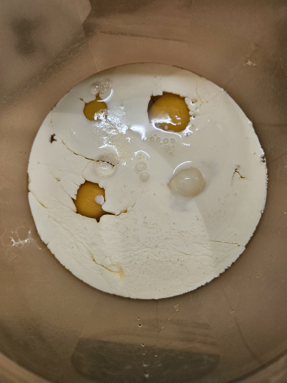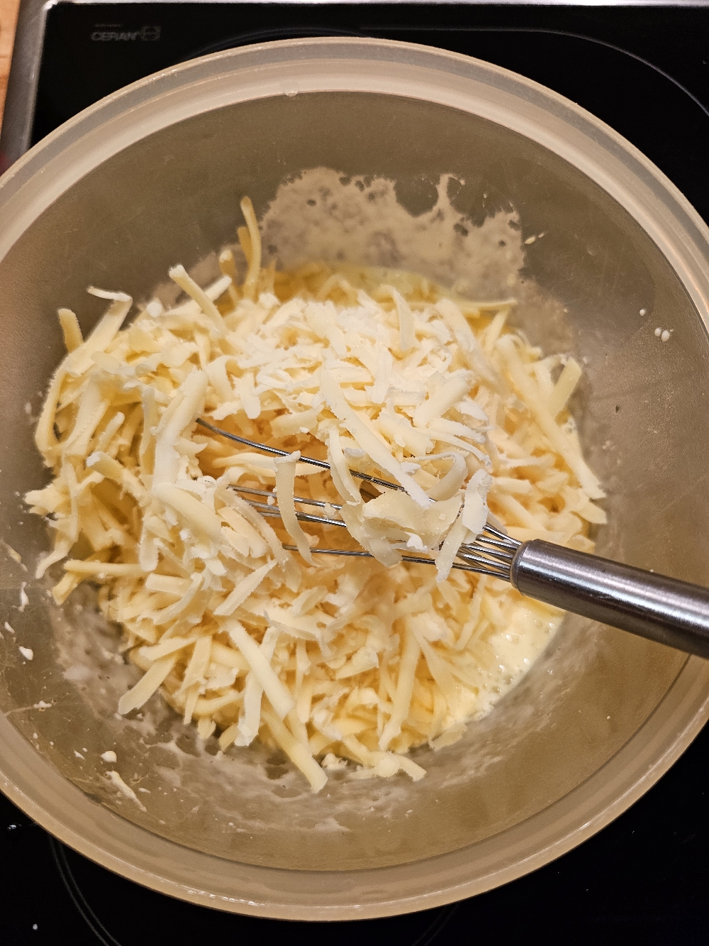 Als nächstes verquirlt ihr die 4 Eier in einer großen Schüssel, gebt die Sahne den Käse und die Gewürze dazu und vermengt alles miteinander.