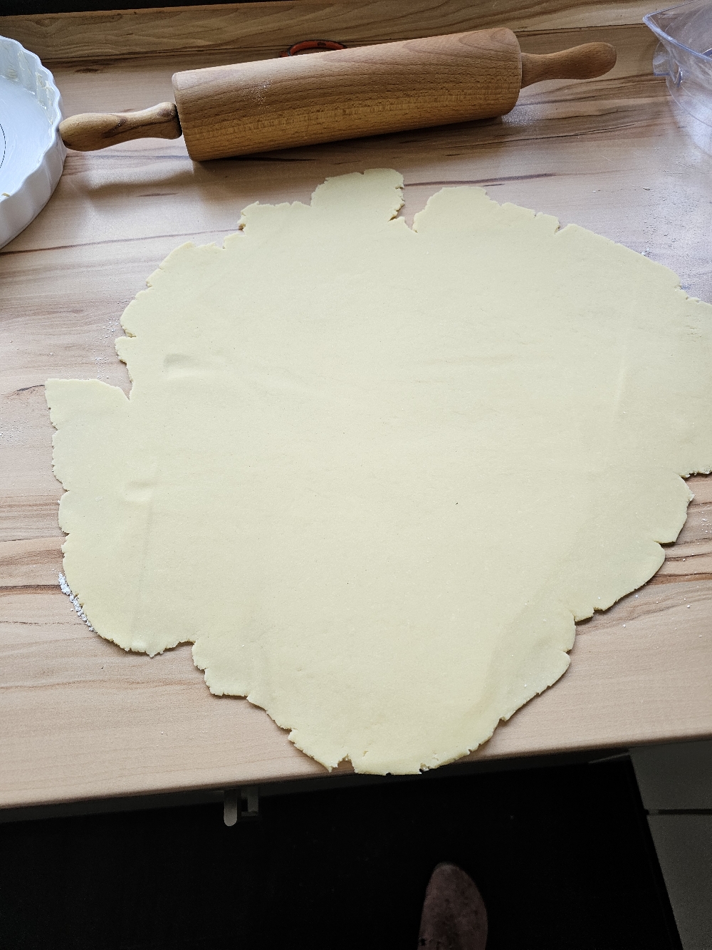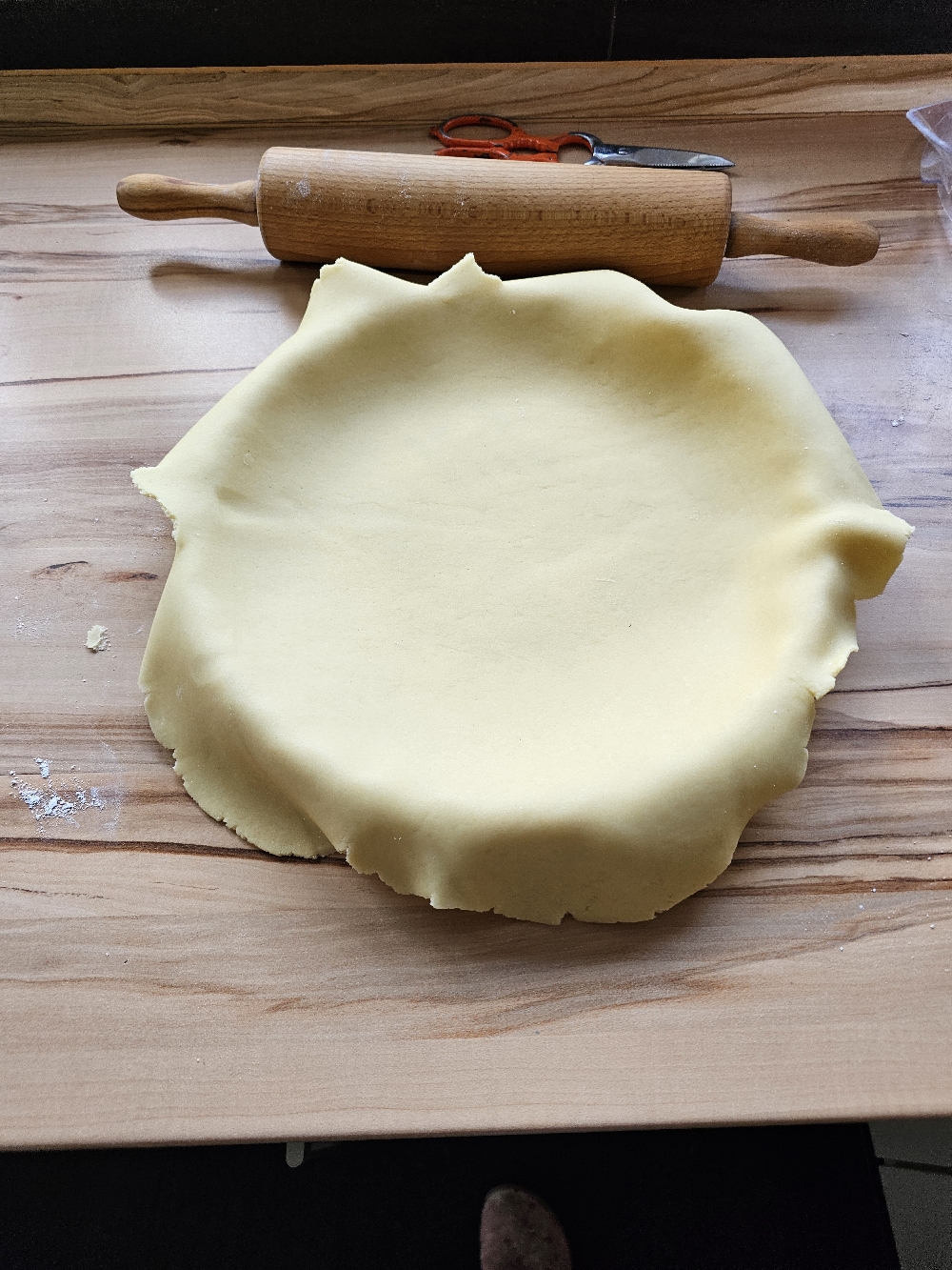 Nach der Kühlzeit könnt ihr die Arbeitsfläche bemehlen. Den Teigklumpen auf die bemehlte Arbeitsfläche legen. Das Nudelholz auch bemehlen und den Teig zu einem Kreis ausrollen. Von der Mitte nach außen. Backofen auf 180°C Ober- und Unterhitze vorheizen.