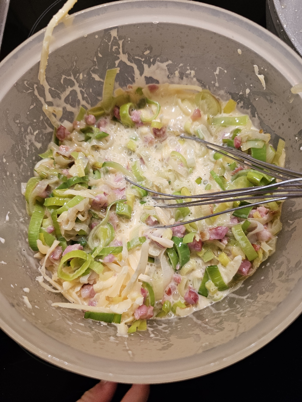 Zum Schluss rührt ihr noch die Lauch-Speck-Masse unter und verteilt die Masse danach gleichmäßig auf dem vorgebackenen Teig.