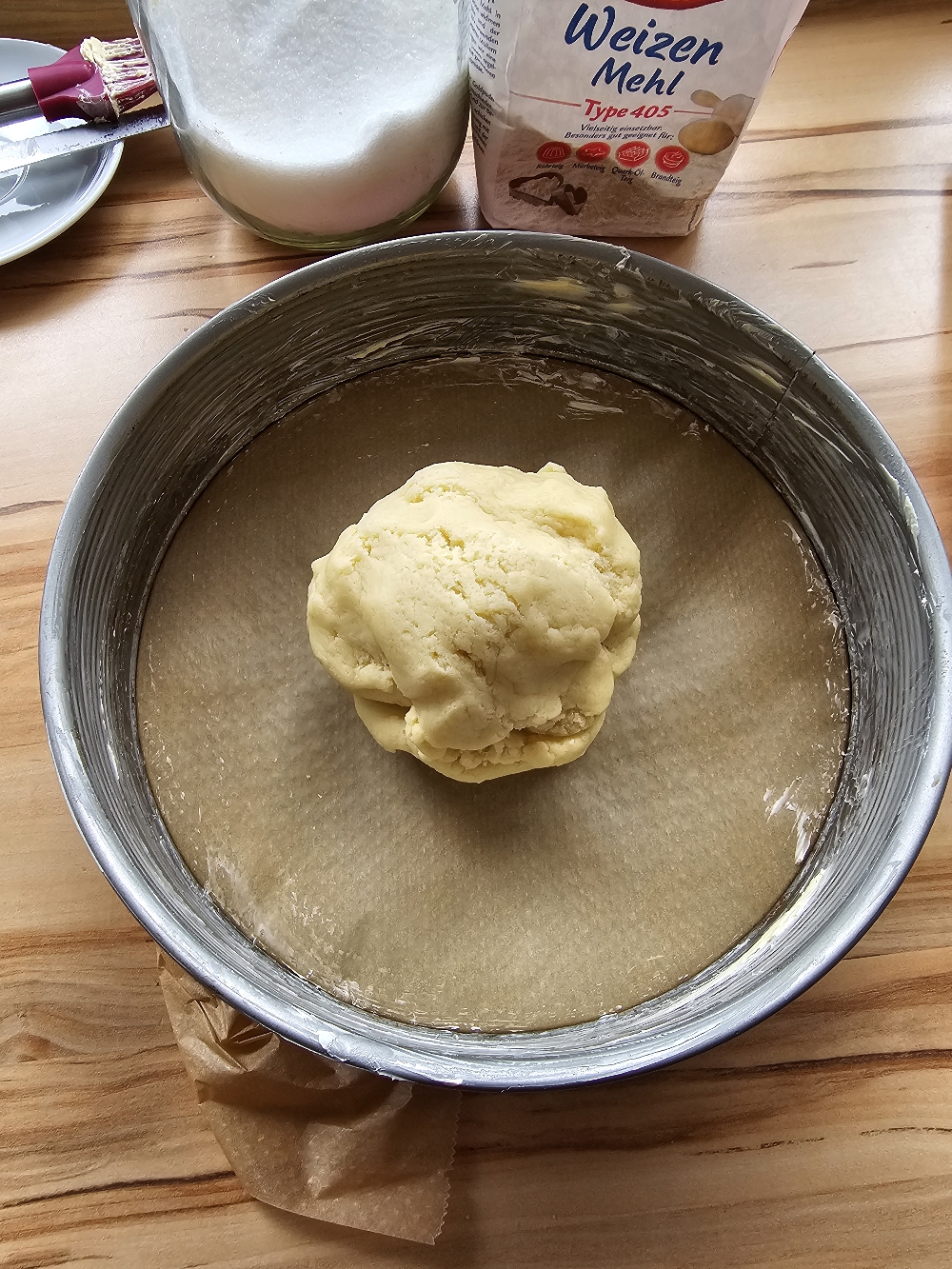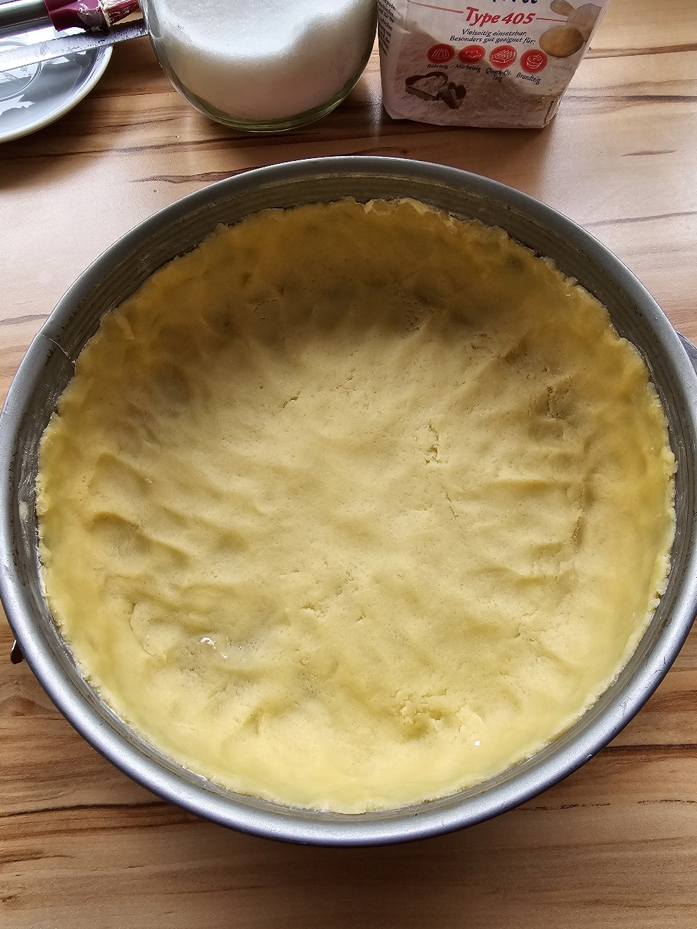 Den Backofen auf 160°C Umluft vorheizen. Eine Springform mit Backpapier belegen. Den Teig gleichmäßig auf dem Boden der Springform auslegen und den Teig an den Rändern hochziehen.